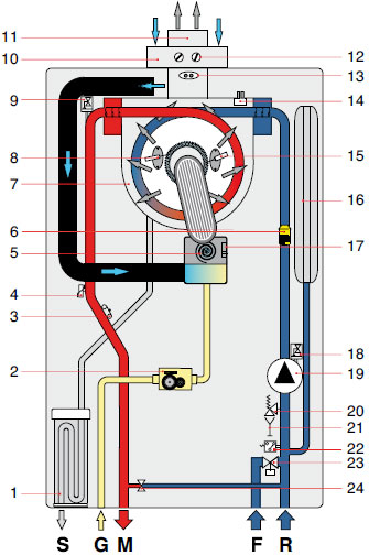 1 сифон для слива конденсата 2 модуляционный газовый клапан 3 датчик температуры системы отопления 4 предохранительный термостат 5 модуляционный вентилятор горелки 6 реле протока контура отопления 7 первичный конденсационный теплообменник 8 электрод розжига 9 воздухоудалитель 10 воздухозабор 11 дымоотвод 12 гнездо отбора проб дымовых газов 13 термостат дымовых газов в дымоотводе 14 термостат дымовых газов на теплообменнике 15 электрод контроля пламени 16 расширительный бак 17 датчик контроля вентилятора 18 воздухоудалитель 19 циркуляционный насос 20 предохранительный клапан 3 бар 21 сливной кран 22 реле минимального давления 23 кран подпитки 24 автоматический байпас