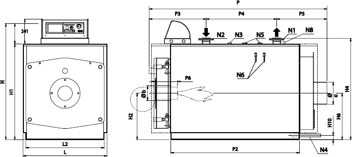 N1 Подающий контур котла N2 Обратный контур котла N3 Патрубок для измерительных приборов N4 Патрубок для слива воды из котла N5 Патрубок предохр. клапана (ов) N6 Колодцы для чувствительных элементов датчиков N8 Колодец для контрольного термометра